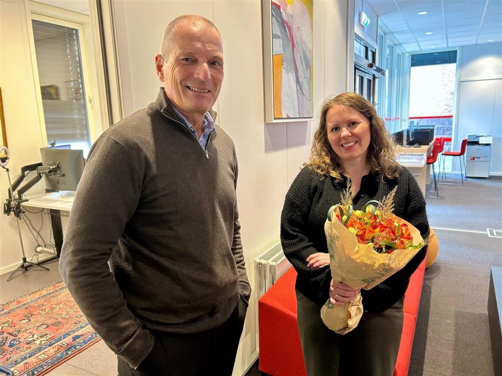 TAKKET AV: Julie Estdahl Stuestøl (MDG) sikra seg stortingsplass under høstens stortingsvalg, og nå har hun fått fritak fra vervet som kommunestyrerepresentant i Tønsberg. Med seg på veien til Oslo hun fikk blomster og gode ord fra ordfører Frank Pedersen. Foto: Tønsberg kommune.