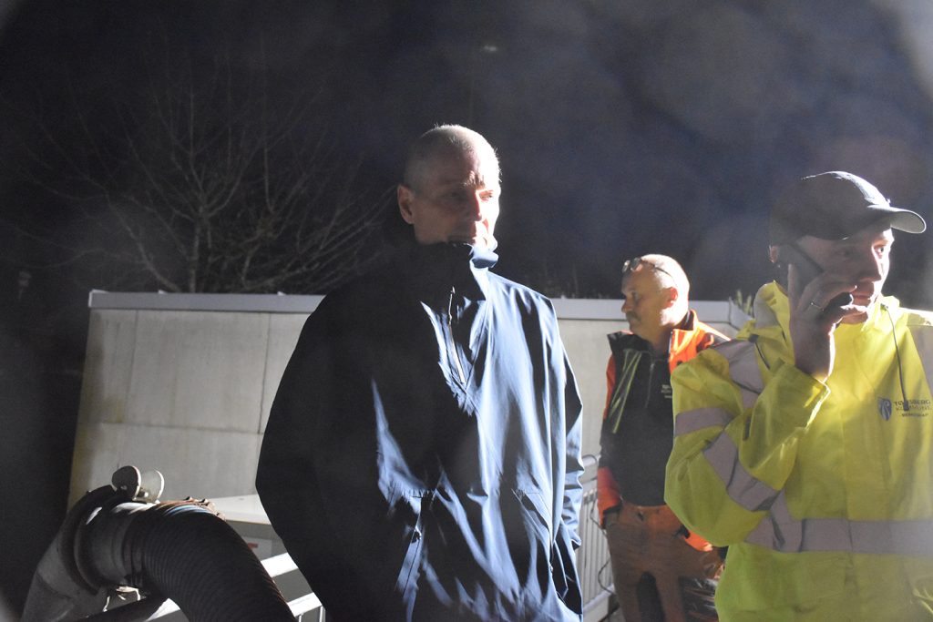 OPPFORDRING: Ordfører Frank Pedersen og fungerende kommunedirektør Frode Hestnes på Revetal i kveld. De oppfordrer folk til å passe på seg sjøl og andre i uværet. Foto: Stian Ormestad, ReAvisa.