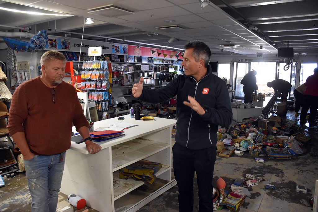 STORE ØDELEGGELSER: Hovs er verst ramma, men også andre butikker med lager på nederste nivå og alle butikkene som må holde stengt på grunn av strømbrudd. Også kjelleren til sportsbutikken er totalskadd. Foto: Stian Ormestad, ReAvisa.