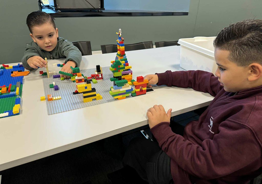 FIN HØSTFERIE: Legolørdag var en slager tidligere i høst- og vinterferier, i denne ferien er det legotirsdag og legoonsdag. Hamza (6) og lillebroren Thaer (4) liker det veldig godt, og har vært med de aller fleste gangene. Foto: Stian Ormestad, ReAvisa.