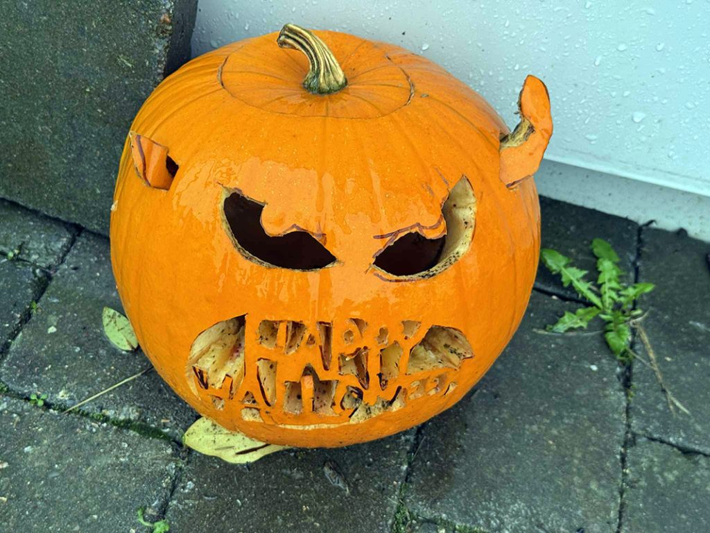 KLASSISK HALLOWEEN: Et skummelt gresskar ved døra inn til gårdsbutikken. Foto: Stian Ormestad, ReAvisa.