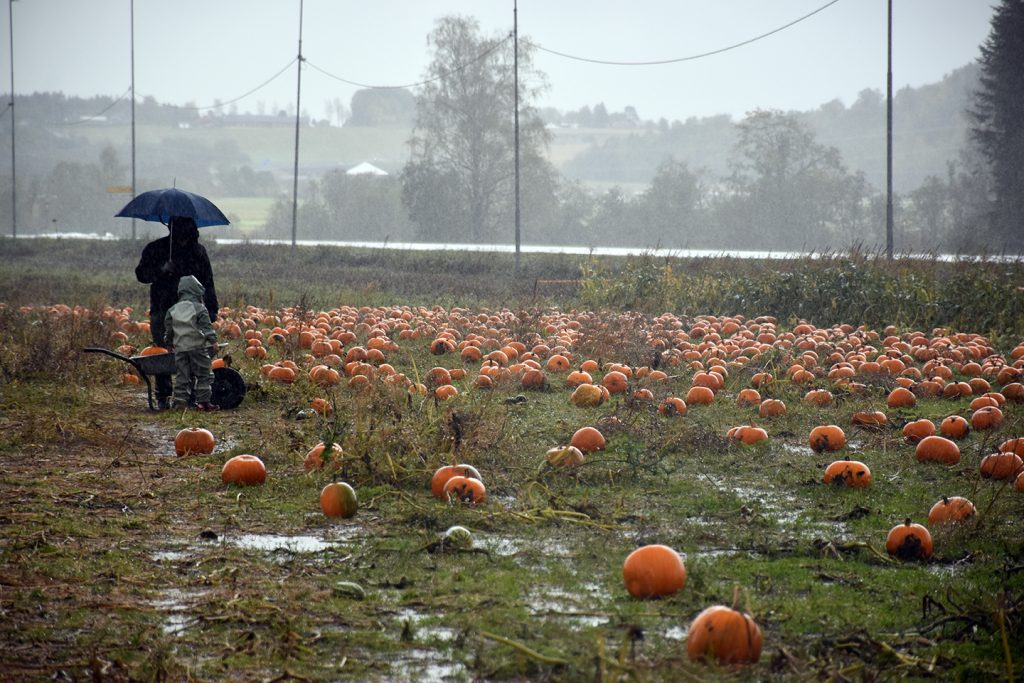TUSENVIS: I løpet av ett par helger har folk stått i kø for å plukke gresskar her på Hem gård i Undrumsdal. Da ReAvisa var innom i siste innspurt sist søndag var det heller lite folk i regnværet, men masse gresskar igjen fortsatt. Foto: Stian Ormestad, ReAvisa.