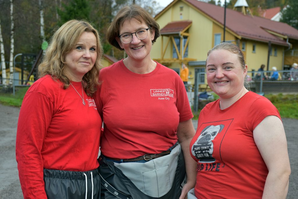 GLAD FOR AKSJONEN: Tre av de mange rødkledde i Linnestad barnehage i dag: Synnøve Lie Sørensen, Anne Gry Lehmbecker Vestland og Kristine Bøe. De mener det er viktig å aksjonere og håper på å bli hørt, i sin stille rødkledde protest. Foto: Stian Ormestad, ReAvisa.