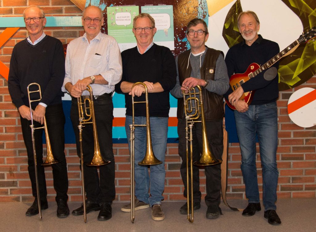 ARRANGEMENTSKOMITE: Trombonegruppa var også arrangementkomite i 2017, fra venstre Thor Ole Johnsen, Trond Antonsen, Aadne Søyland, Vidar Engelstad og styreleder/gitarist Trygve Sivertsen. Foto: Storbandet Fokus.