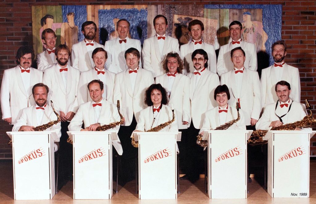 STILIG GJENG I HVITT: I helhvitt og en liten rød sløyfe stiller hele besetninga opp til fellesbilde på tampen av 1980-tallet, bildet er datert 1989. Foto: Storbandet Fokus.