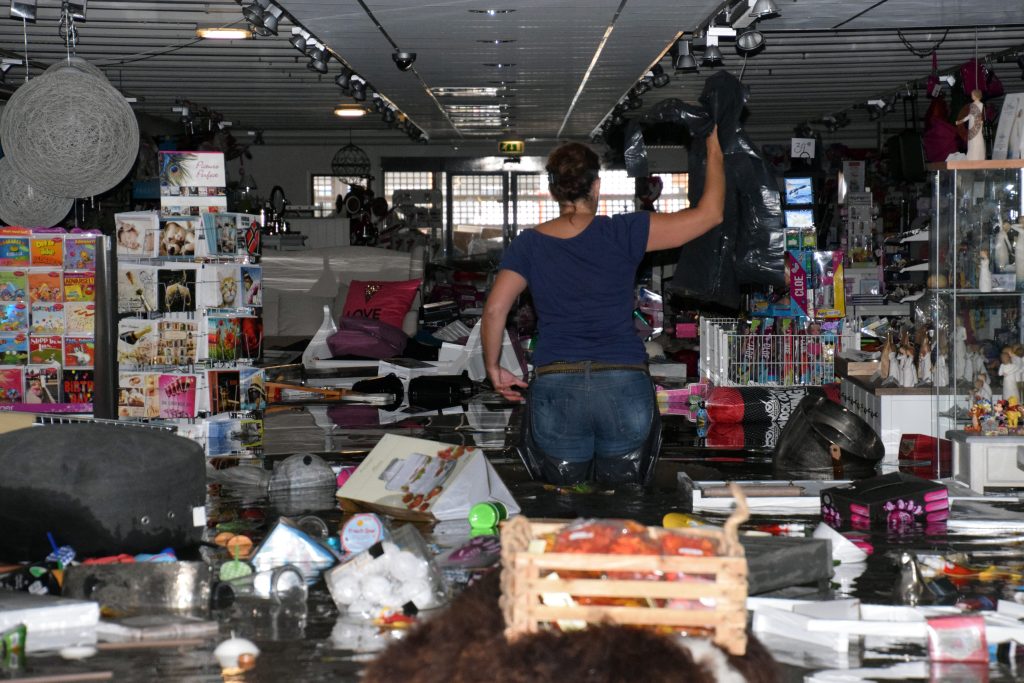 HARDT RAMMA – IGJEN: Jarle Magnussen på Hovs marked redder det som reddes kan. To ganger på ti år er butikken hardt ramma og totalskadd i flom. Foto: Stian Ormestad, ReAvisa.