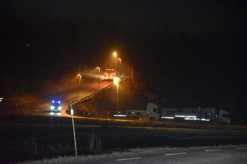 NØDETATER: Enda en brannbil på vei opp, og en politibil på vei ned. For å stenge veien opp til Linnestad næringsområde for all annen trafikk enn nødetater. Foto: Stian Ormestad, ReAvisa.