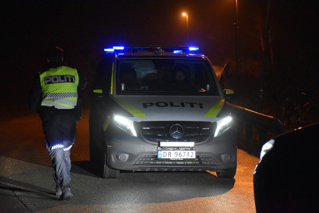 SPERRER VEIEN: Linnestad næringsområde er nå stengt fra Bjuneveien i bånn av næringsområdet. – Dette på grunn av tett røyk lenger oppi feltet, forteller politipatruljen. Foto: Stian Ormestad, ReAvisa.