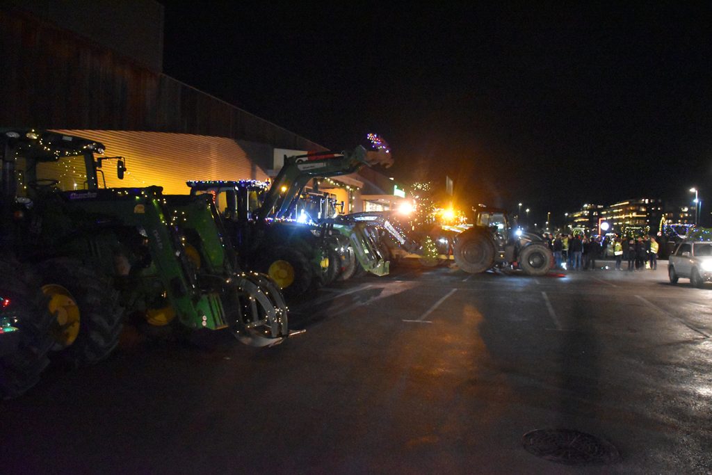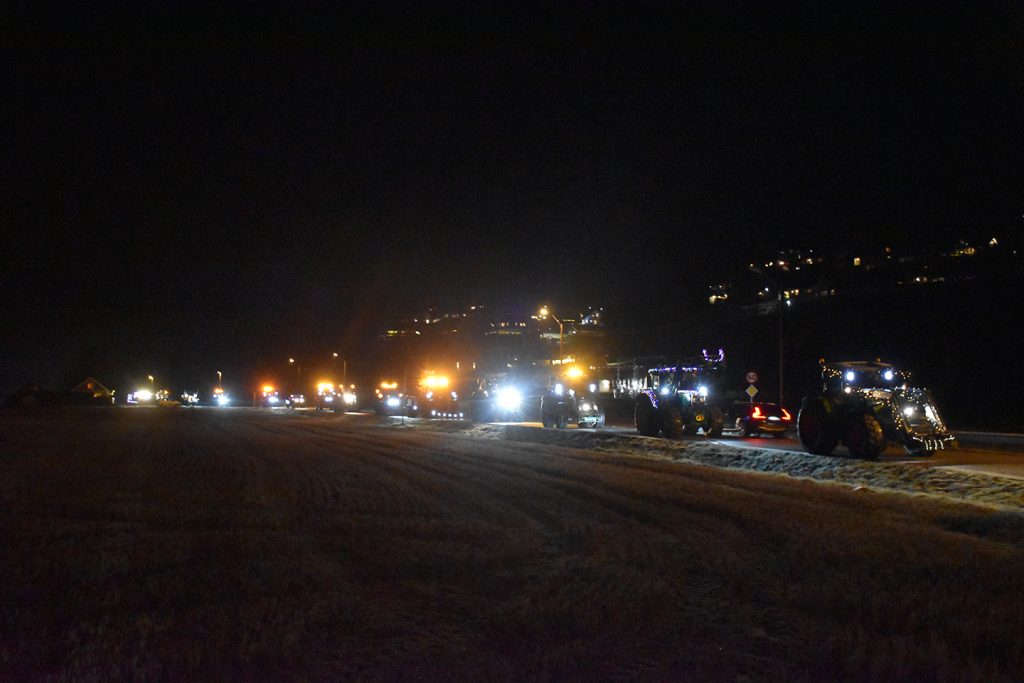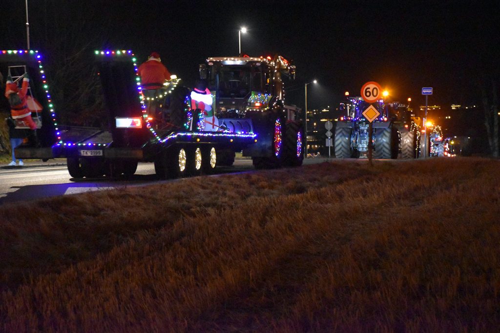 Straks framme – rundt 40 traktorer og flere andre slags doninger, pluss ett par tråsykler og annet som var pynta med julelys og annet stæsj. Foto: Stian Ormestad, ReAvisa.
