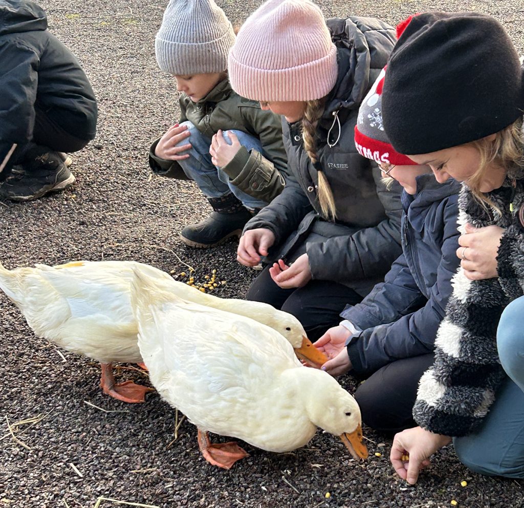 MATING: Ivrige ender på jakt etter mat fra gavmilde hender. Foto: Ramnes søndre gård.