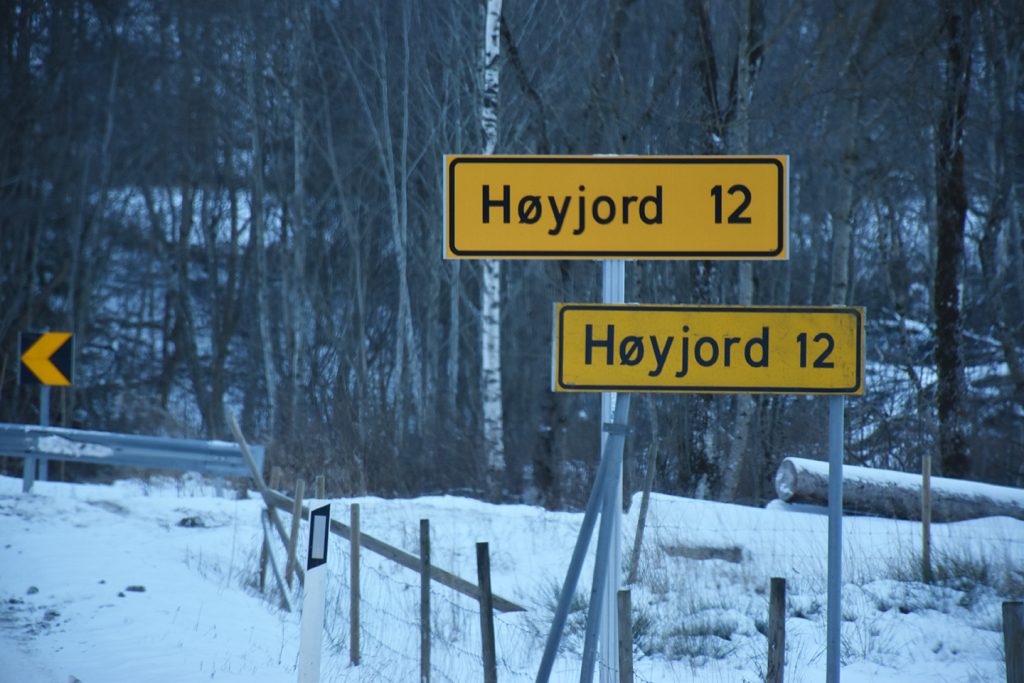 «Da er det bare 12 kilometer til Høyjord igjen», med bilde som viser at ett skilt står der nå.