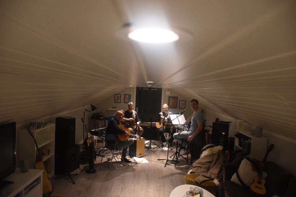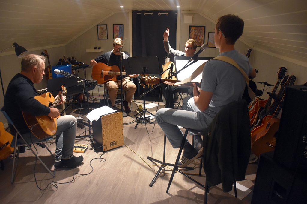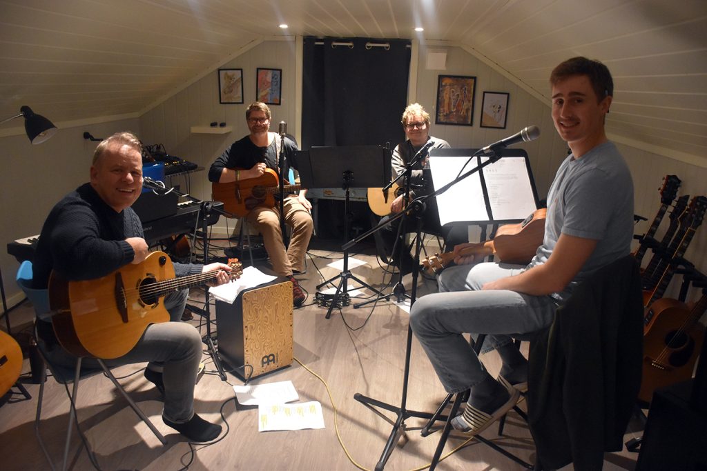 Lokalavisa var innom en øving og kan skrive under på at dette var trivelige toner: Fire gitarer, fire sangstemmer, med innslag av både ukulele og munnspill.