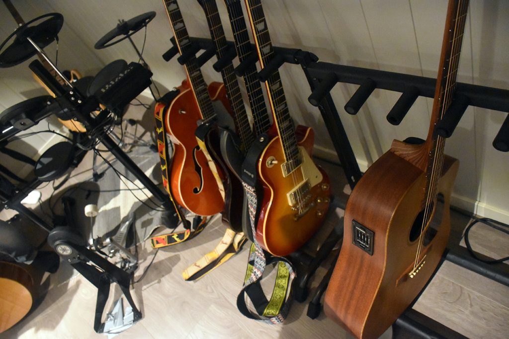DET SKA’KKE STÅ PÅ UTSTYRET: Fire gitarspillere og førti gitarer på øvingsloftet til Thor-Morten i Kileveien i Ramnes. Foto: Stian Ormestad, ReAvisa.