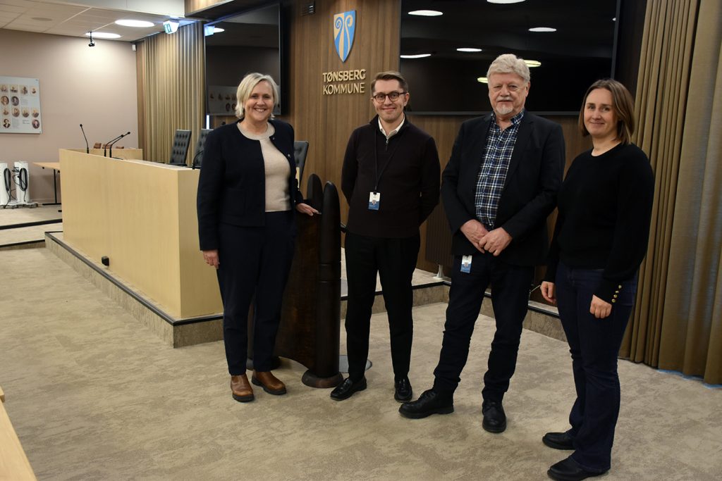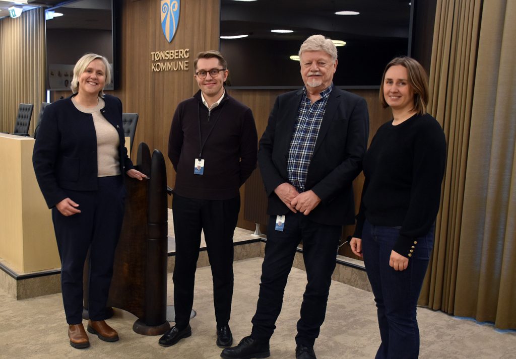 VIL BEHOLDE BARNEHAGEN: ReAvisa møter representanter for hele posisjonen på rådhuset i Tønsberg, fra venstre Stine Ness Askjer (KrF), Mathias Willassen Hanssen (H), Bent Molvær (FrP) og Julia Kristoffersen (V). Foto: Stian Ormestad, ReAvisa.