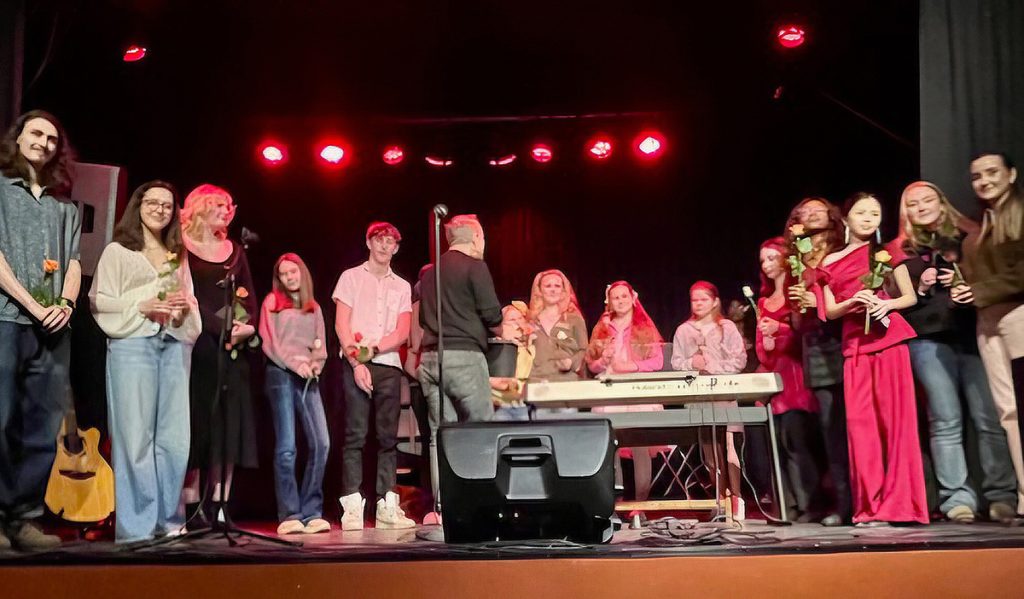ALLE TALENTENE: En rose til alle artistene, fra venstre: Johannes Stripa Lorentzen Mandal, Lauryna Stan, Celina Bergqvist, Hillevi Maria Wettestad, Casper Solberg, arrangør Frank Wedde, Ellinor Andersen, Esther Serina Andersen, Amela Botonjic, Martina Bøe Kopstad, Jasmin Mehter, Nicolette Imuentinyanosa Idehin, Teodora Borislavova Ivanova, Alma Finsrud og Milla Grace Borgvin-Burgess. Ikke på bildet, men artister på scenen: Mona Ilias Abdillahi, Olivia Fosshaug Leth, Amelia Larsen og Mikkel Bergli. Foto: Privat.