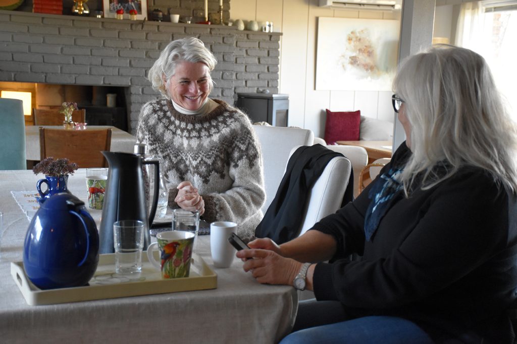 STYRELEDER: Ingunn Henriksen Leeber i NaKuHel Vestfold som står bak Revetalhage og -hus. Her i prat med Mette Mørken som er en mye brukt konsulent i spørsmål rundt universell utforming. Hun er medlem i foreninga og frivillig på huset, og ble veldig engasjert i saken. Foto: Stian Ormestad, ReAvisa.