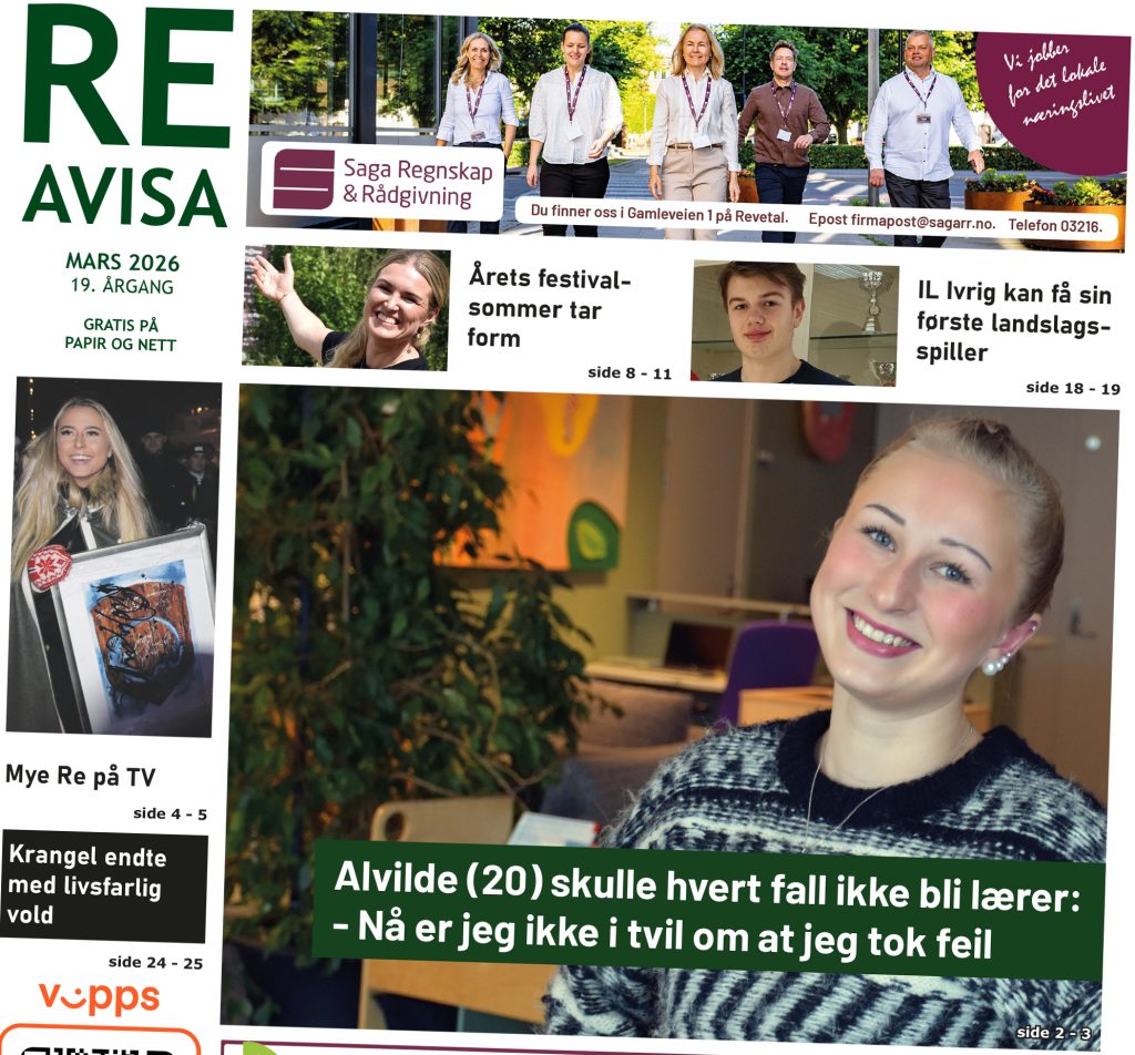 LOKALT LESESTOFF: ReAvisa har spesielt fokus på innlands-Vestfold og dekker primært gamle Re kommune med sogna Våle, Ramnes, Fon, Undrumsdal, Vivestad og bygdebyen Revetal. Ei fersk avis er nå klar for å leses, enten med avisa i handa eller her på skjermen. Faksimile: ReAvisa mars 2026.