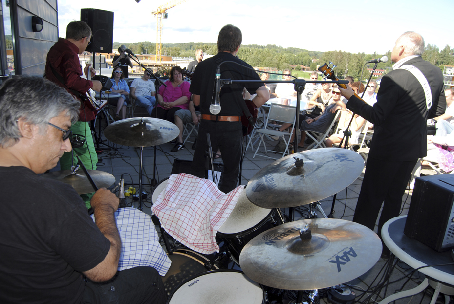 MINNEVERDIG: Takkonserten for 15 år siden var et fantastisk påfunn, for å hylle heltene i originalen The Beatles. Nede på bakken kunne alle Re minifestival-gjestene og handlende på Re-torvet høre konserten. Noen få fikk se den live på taket. Foto: Stian Ormestad, ReAvisa.